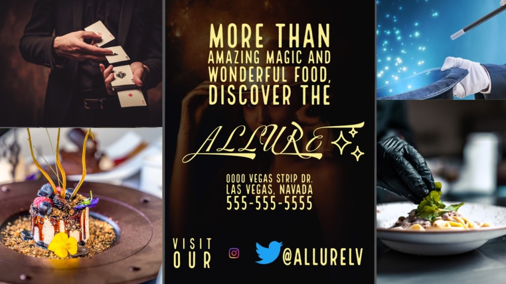This is my concept for a Magic themed restaurant called Allure. It is inspired by Penn and Teller and the speak easy. The front looks like a 50’s inspired diner where those in the know will get access to the secret door. Through the secret door lies the lounge where slight of hand master preform illusions before you enter the main room. Here special magic themed menus will awe your eyes and your mouth. This will be followed by performances by top illusionists and magic performers.